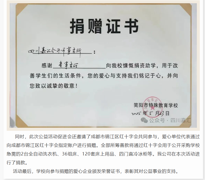 嘉汇公益丨四川嘉汇董事长参加简阳市特殊教育学校捐资助学活动
