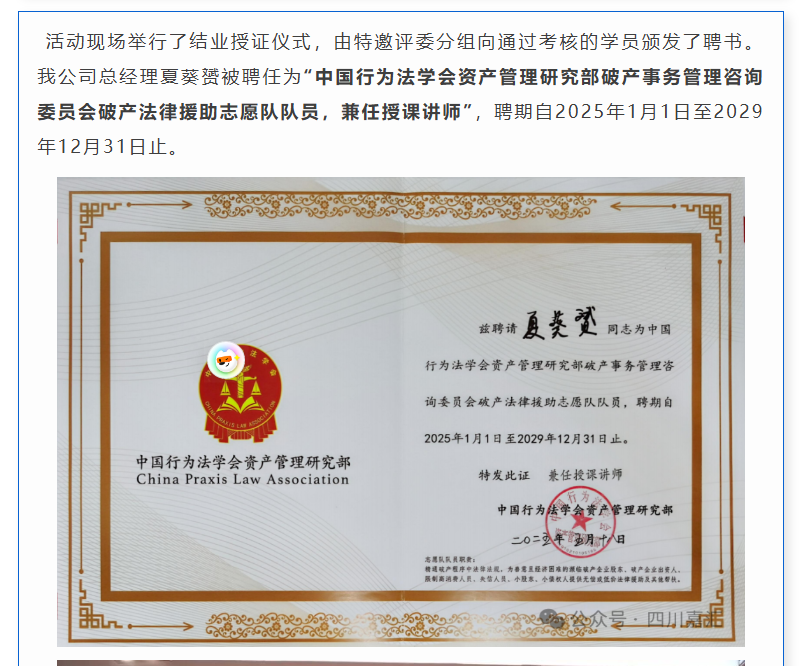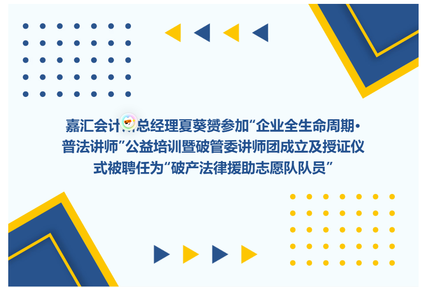 嘉汇会计所总经理夏葵赟参加“企业全生命周期·普法讲师”公益培训,被聘任为“破产法律援助志愿队队员”